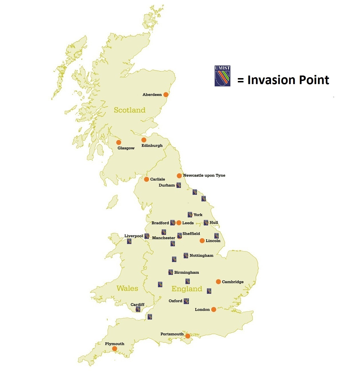 This is the new home for the UMIST MEDE Society. The map below shows the cities and towns that have been 'invaded' over the years. Each UMIST icon indicates an invasion point. Hover over to see the year and place or click to see the details